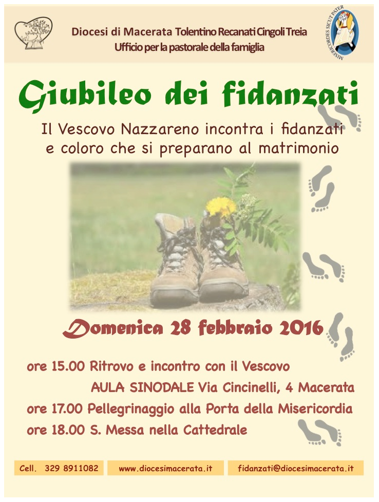 A tutte le coppie che si stanno preparando al matrimonio monsignor Nazzareno Marconi ha rivolto il caloroso invito a partecipare al «Giubileo dei fidanzati». È ormai tradizione che ogni anno il Vescovo incontri i fidanzati per un momento di riflessione seguito da uno scambio di idee ed esperienze. Domenica 28 febbraio alle ore 15 l’aula sinodale annessa alla Domus San Giuliano accoglierà le 250 coppie che in vari centri della Diocesi stanno seguendo i percorsi di accompagnamento al matrimonio.