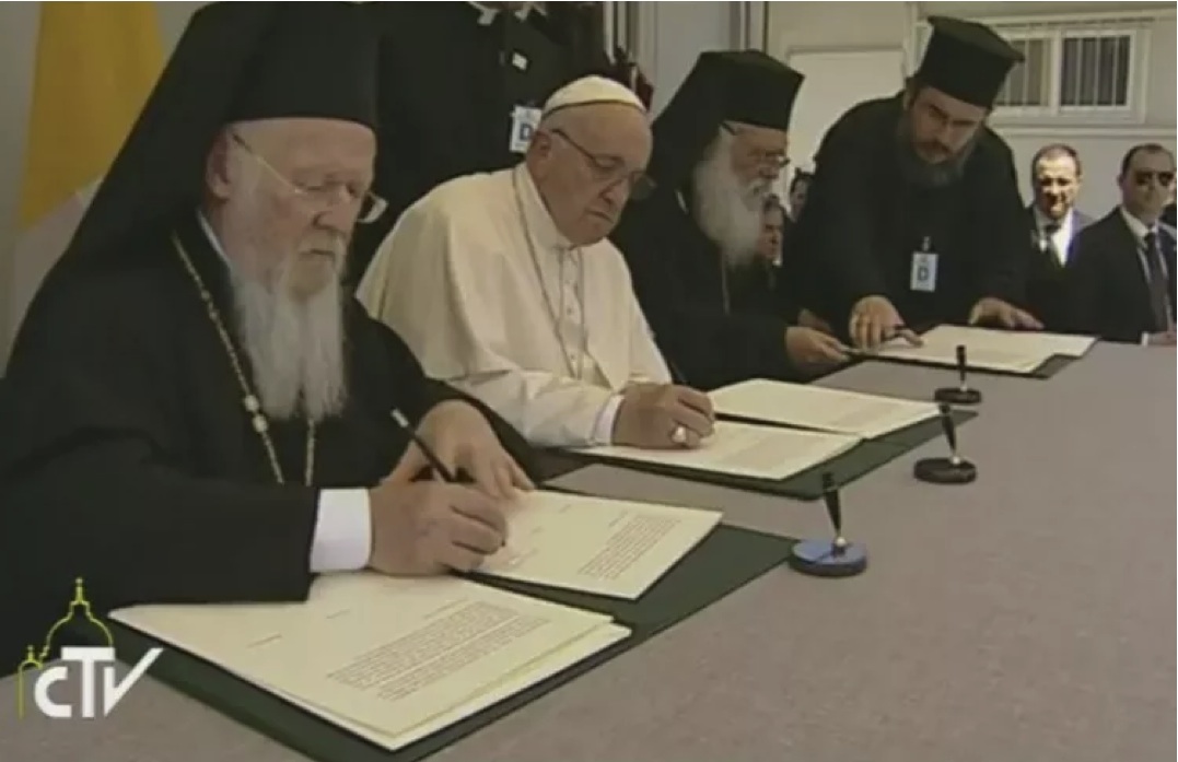 Un’implorazione solenne per «la fine della guerra e della violenza in Medio Oriente, una pace giusta e duratura e un ritorno onorevole per coloro che sono stati costretti ad abbandonare le loro case». A rivolgerla sono, insieme, Ieronymos II, Arcivescovo di Atene e di tutta la Grecia, papa Francesco e Bartolomeo I, patriarca ecumenico di Costantinopoli, nella Dichiarazione congiunta firmata oggi nel Mòria refugee camp di Lesbo (qui il programma completo della visita).