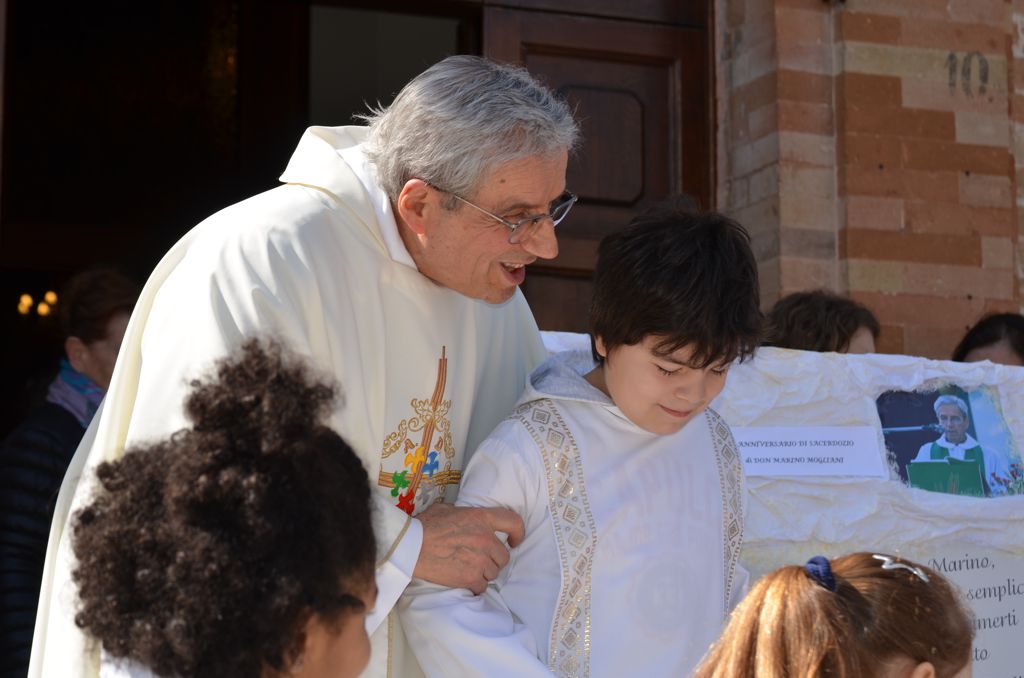 A te caro don Marino rivolgiamo questo augurio: Gesù continui ad esserti sempre vicino, Lui che da sempre risplende in tutto il tuo modo di proporti, continui ancora ad essere l’unico principio e fine di ogni tua azione. Ricordaci sempre nelle tue preghiere ( come dice Papa Francesco) cosi come noi ti ricordiamo nelle nostre, perchè ormai da tempo ti consideriamo appartenente ad ogni famiglia. Tu infatti , sei partecipe di tutti gli atti più solenni della nostra vita : Benedici i nostri matrimoni , i nostri bimbi nel battesimo, apri il cuore dei nostri fanciulli che ricevono per la prima volta Gesù Eucaristia , guidi i nostri giovani sulla via del bene che viene dalla Confermazione, benedici i nostri ammalati e i nostri morti . Sei sempre pronto ad accoglierci con benevolenza, ad ascoltarci e dire una parola di sollievo e di conforto a tutti, a perdonarci anche quando non siamo dei buoni parrocchiani.