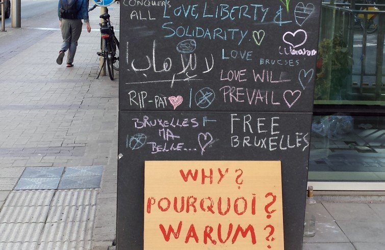 L’anziano signore si avvicina camminando adagio, schivato dalle biciclette che corrono lungo la corsia loro riservata sullo stesso marciapiedi. All’altezza del numero 85 di Rue de la Loi si ferma, toglie il cappello e deposita un fiore. Sosta in raccoglimento. Poco dopo arrivano due ragazze, borsa a tracolla e auricolari. Rallentano il passo. Una delle due accenna a un segno di croce. Quindi ripartono. Dinanzi all’uscita del metro di Maalbeek, ancora transennata, si accumulano mazzi di fiori, una bandiera belga, alcuni bigliettini, un paio di fotografie, due lumi rossi e un cartello scritto a mano che recita in francese il capitolo 13 della prima lettera ai Corinzi «Quand je parlerai les langues des homme et des anges, si je n’ai pas l’amour…». È trascorso un mese da quel 22 marzo, con le bombe all’aeroporto e alla metropolitana di Bruxelles: il ricordo resta vivo, accostato a un senso di impotenza e alla voglia di riscatto.