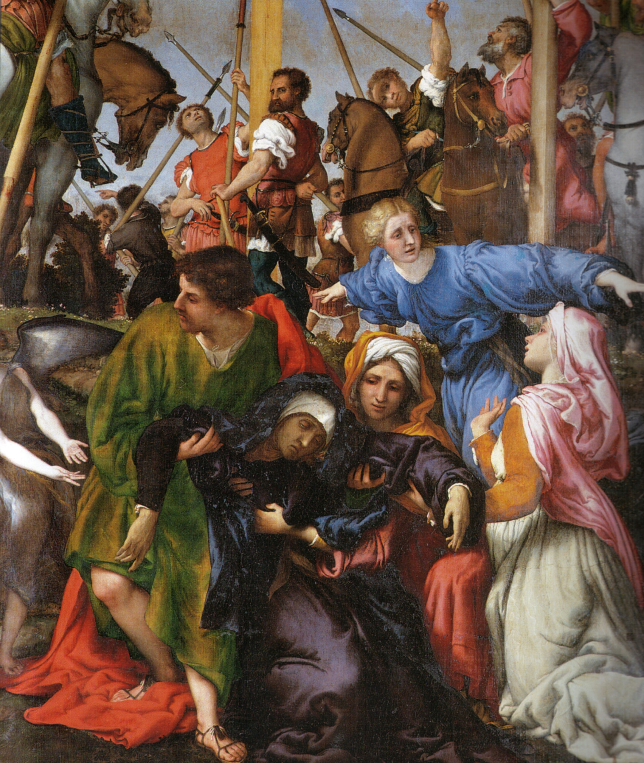La novità più rilevante è costituita dall’ipotesi di un viaggio fin qui inedito compiuto da Lotto nel 1522 in Sassonia, a Lipsia e a Wittemberg, dove egli sarebbe entrato in contatto con un dipinto decisamente luterano, l’“Epitaffio Schmidburg” di Georg Lemberger, che viene individuato come il modello adottato per la Crocifissione, opportunamente modificato nel contenuto religioso. Se a Lipsia il soggetto è il rapporto della famiglia committente con le Sacre Scritture, a Monte San Giusto il fulcro è rappresentato dall’apostolo Giovanni rivolto verso Bonafede intento alla pratica della devotio moderna, in tal modo partecipe al mistero del Calvario e destinatario esclusivo del messaggio evangelico da trasferire ai fedeli.