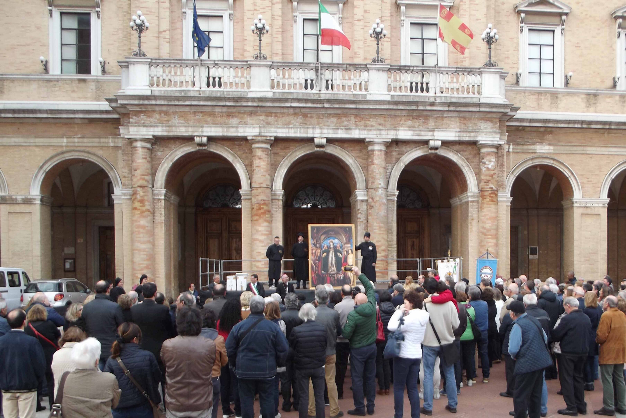 Continua il cammino della Mater Misericordiae nei comuni della Diocesi. Nel pomeriggio del 30 aprile l’icona è arrivata in piazza Giacomo Leopardi, dando così inizio alla tappa recanatese della peregrinatio mariae. Ad aspettarla c’erano il vescovo Nazzareno Marconi, il sindaco Francesco Fiordomo insieme a tutta la giunta comunale, i parroci delle parrocchie che ospiteranno i centri di ascolto, don Pietro, don Rino, don David, don Alejandro e un gruppo di fedeli.