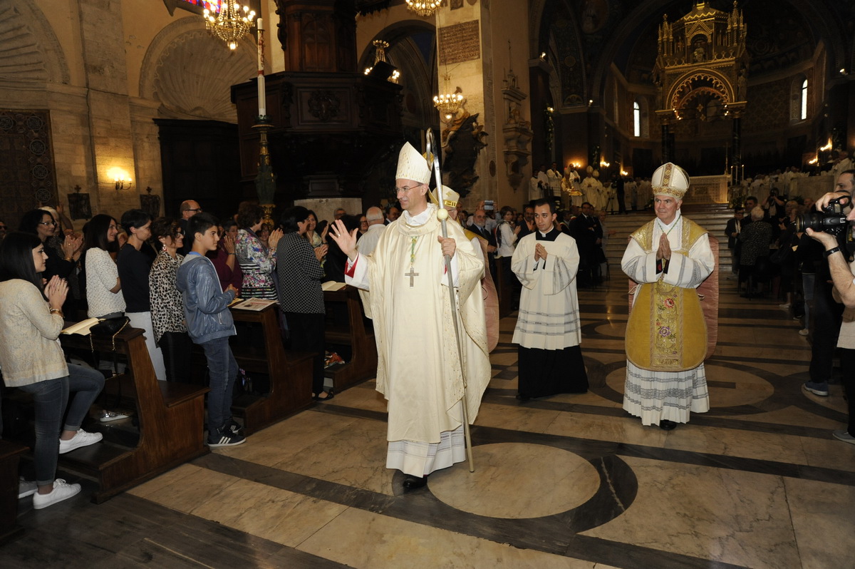 Gremita l’antica cattedrale ed altrettanto stracolmo il cinema nel cuore della città picena, in cui i familiari, i fedeli, il numeroso clero, religiosi e religiosi e tantissimi conoscenti hanno voluto festeggiare il neo Vescovo, che nonostante l’emozione non ha mancato di salutare la sua gente con una battuta, nel suo primo saluto da presule: «Credo che questa sia una celebrazione da “Guinness dei primati”, dal momento che non è mai capitato che quattro vescovi ascolani concelebrassero insieme l’Eucaristia e questo è avvenuto grazie a Francesco Marinelli (vescovo emerito di Urbino, ndr), Piero Coccia (arcivescovo di Pesaro, ndr) e Giuseppe Petrocchi (arcivescovo de L’Aquila, ndr), oltre al sottoscritto».