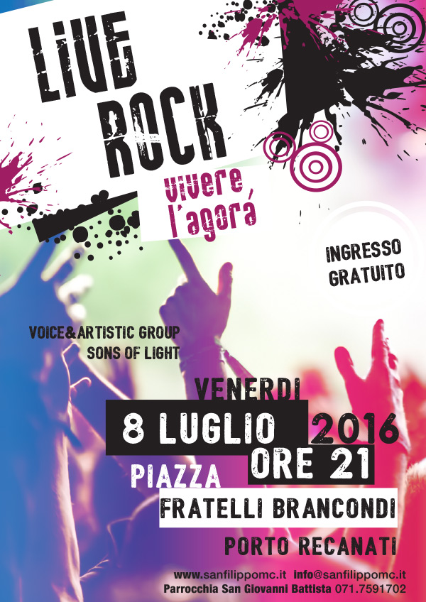 È in programma per venerdì 8 luglio Live Rock, vivere l’agorà, l’iniziativa che vedrà l’esibizione dei Figli della Luce a Porto Recanati, presso il Kursaal Lido. L’appuntamento – ad ingresso gratuito – è per le ore 21. Per ulteriori informazioni: www.sanfilippomc.it