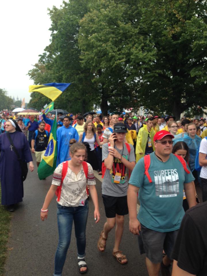 La pioggia infastidisce il cammino, ma non è stata in grado di smorzare passi ed entusiasmi, nè ha sminuito il secondo momento topico della giornata, quando il Papa nel parco Blonia, affollato all’inverosimile (si stima un milione di persone, e la mente già corre alla Messa di domenica nel Campus Misericordiae…) ha pronunciato il suo discorso rivolgendo il primo pensiero al figlio illustre di questa terra. «Vorrei ringraziare san Giovanni Paolo II – ha detto il Pontefice, dopo i balli tradizionali che ogni Paese ha esibito e la carrellata degli esempi di santità giovane venerati in ogni continente – che ha sognato e ha dato impulso a questi incontri. Dal cielo egli ci accompagna nel vedere tanti giovani appartenenti a popoli e culture così diverse con un solo motivo: celebrare che Gesù è vivo in mezzo a noi».