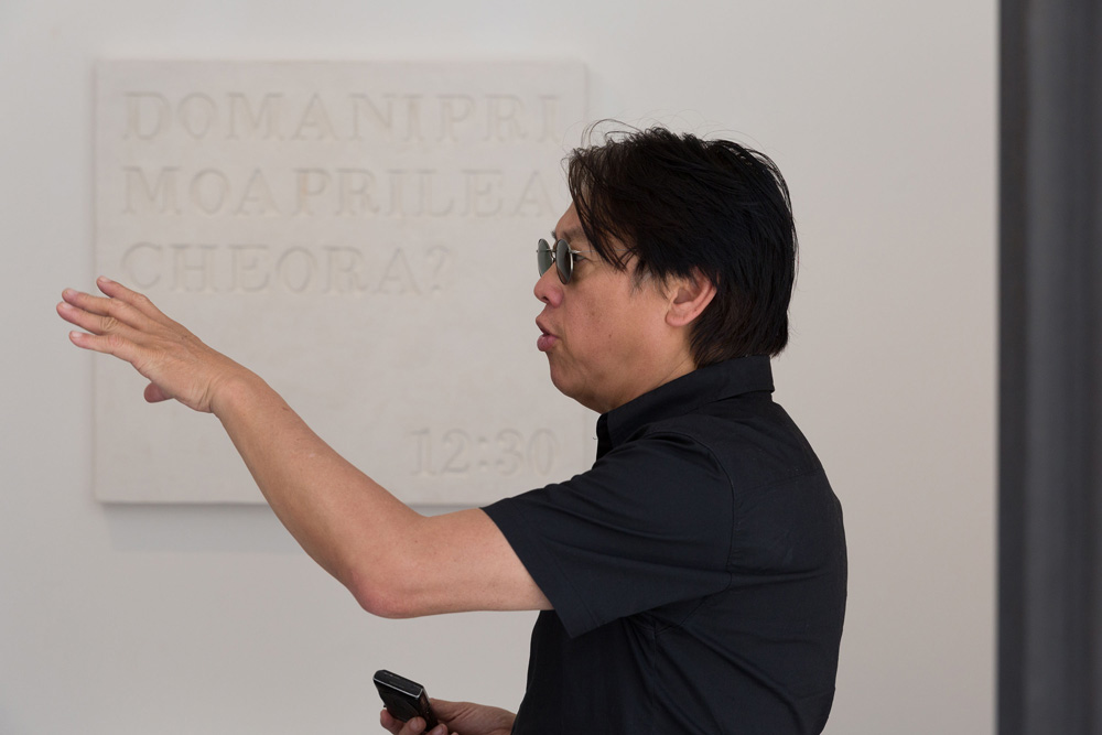 In mostra anche i simboli dell’artista, le valigie e le sedie, un ossimoro visivo dell’uomo nomade sempre alla ricerca di nuove mete e dell’uomo riflessivo che trova nella stasi il punto migliore di contemplazione. Al centro, il linguaggio che nella moderna Babilonia diventa il campo di ricerca più ricco di stimoli per H.H.Lim: da quello stilizzato dell’uomo primitivo che incide sulla pietra a quello articolato delle parole che, passando per le mani dell’artista, diventano forme e colori per restituire un linguaggio visivo attuale e universale.