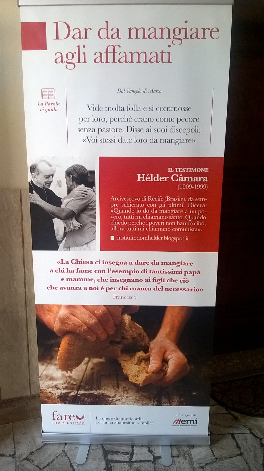 È allestita all’ingresso di palazzo Sarnari, proprio di fronte alla Basilica della Misericordia, la mostra intitolata «Le Opere della Misericordia», prodotta dalla Editrice Missionaria Italiana di Bologna. Si tratta di quindici pannelli che passano in rassegna le quattordici opere della misericordia, ognuna abbinata ad una frase del Vangelo, un personaggio particolarmente conosciuto per averle messe in pratica, una frase di papa Francesco ed infine una foto particolarmente espressiva di quell’opera.