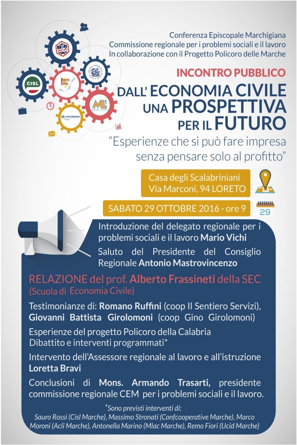 È stato rinviato, per via dei recenti movimenti sismici, il convegno previsto per la mattinata di domani presso la Casa degli Scalabriniani a Loreto (leggi l’articolo). A breve gli organizzatori comunicheranno la nuova data dell’incontro pubblico sull’economia civile.