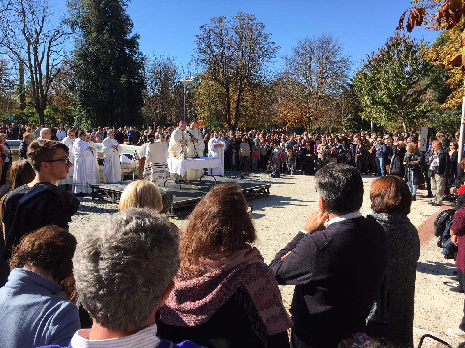 Anche in occasione della festività di Tutti i Santi moltissimi maceratesi si sono ritrovati alle 11.30 ai Giardini Diaz di Macerata, una «cattedrale fornita gratuitamente dal Padre Eterno» per partecipare alla Santa Messa, presieduta dal vescovo diocesano Nazzareno Marconi all’aperto come in gran parte delle parrocchie della diocesi. Un’occasione per vivere questo momento in comunione ed essere vicini ai tanti fratelli della provincia e della regione che stanno soffrendo. Con lui alcuni sacerdoti delle parrocchie della città e la comunità salesiana.