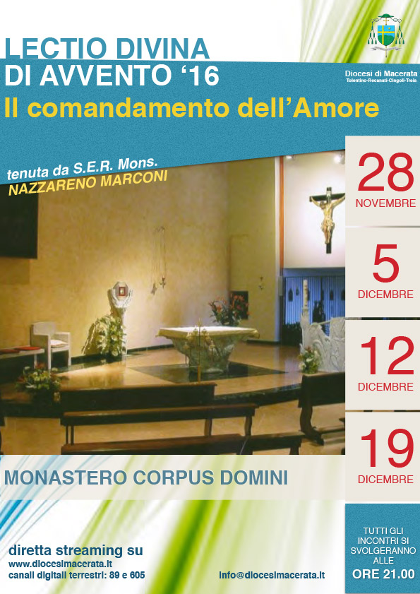 Sarà incentrata su «Il comandamento dell’Amore» la Lectio divina che monsignor Nazzareno Marconi, vescovo di Macerata-Tolentino-Recanati-Cingoli-Treia terrà, sempre alle ore 21 presso il monastero Corpus Domini di Macerata, nei lunedì che precedono il Santo Natale, ossia il 28 novembre e il 5, 12 e 19 dicembre. Nel sito della diocesi la diretta streaming delle serate.