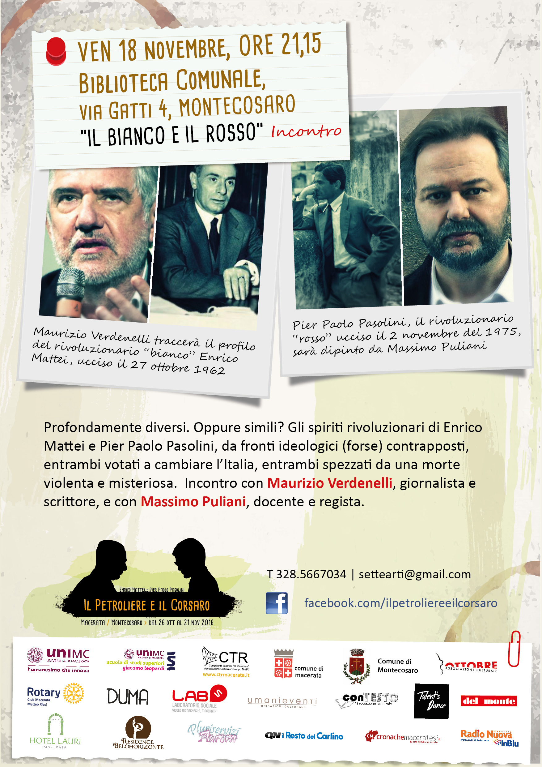 Appuntamento alla Biblioteca Comunale di Montecosaro, venerdì 18 novembre alle ore 21.15, per “Il bianco e rosso”, uno degli eventi centrali del cartellone Il Petroliere e il Corsaro, che mette a confronto i due protagonisti della rassegna. Profondamente diversi. Oppure simili? Gli spiriti rivoluzionari di Enrico Mattei e Pier Paolo Pasolini, di fronti ideologici (forse) contrapposti, entrambi votati a cambiare l’Italia, entrambi spezzati da una morte violenta e misteriosa.