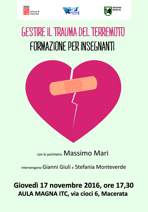 Gestire il trauma del terremoto è il titolo della giornata di formazione rivolta agli insegnanti organizzata dall’Asur Marche A.V.3 con il patrocinio del Comune di Macerata e della Regione Marche, tenuta dallo psichiatra Massimo Mari.