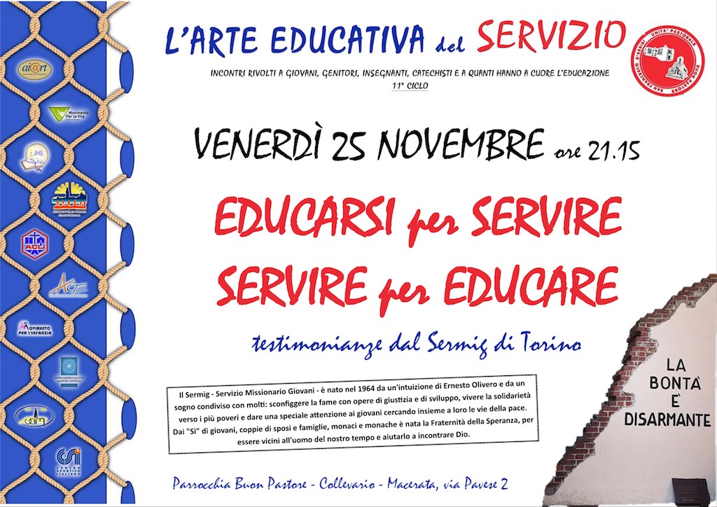 Venerdì 25 novembre alle ore 21,15, presso la parrocchia Buon Pastore di Macerata (quartiere Collevario) prenderà il via l’undicesimo ciclo d’incontri rivolti a giovani, genitori, insegnanti, catechisti e a quanti hanno a cuore l’educazione. L’iniziativa è promossa dalla Rete per l’Educazione che da anni mette in campo la “forza della convergenza” di ben dieci associazioni locali nel progetto (pagina facebook) e fa parte integrante dell’itinerario formativo dell’Unità Pastorale.
