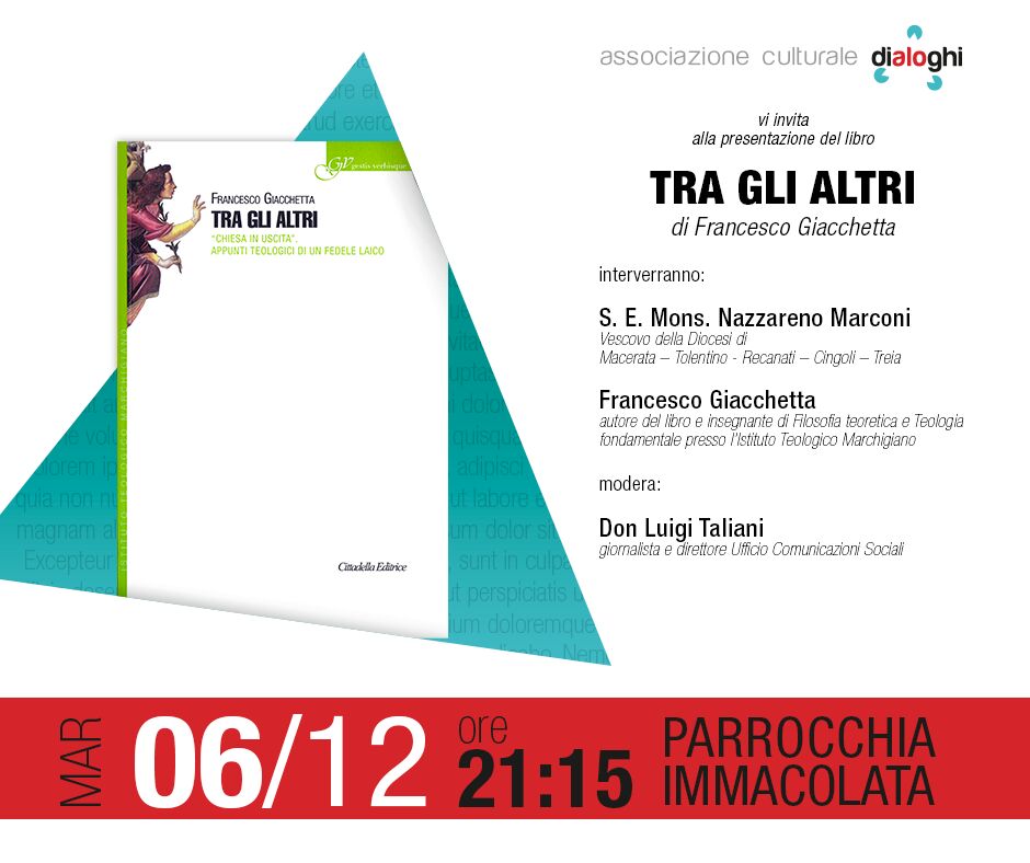 Martedì 6 dicembre alle ore 21.15, la parrocchia dell’Immacolata a Macerata ospiterà la presentazione dell’ultimo libro del professor Francesco Giacchetta, intitolato Tra gli altri. Chiesa in uscita. Appunti teologici di un fedele laico. Docente di filosofia teoretica e Teologia fondamentale all’Istituto Teologico Marchigiano, Giacchetta non è nuovo alla pubblicazione editoriali, numerosi sono infatti i suoi testi. A moderare l’incontro organizzato dall’associazione culturale “Dialoghi” sarà don Luigi Taliani, direttore dell’Ufficio per le comunicazioni sociali della Diocesi di Macerata. Interverrà anche il vescovo monsignor Nazzareno Marconi.