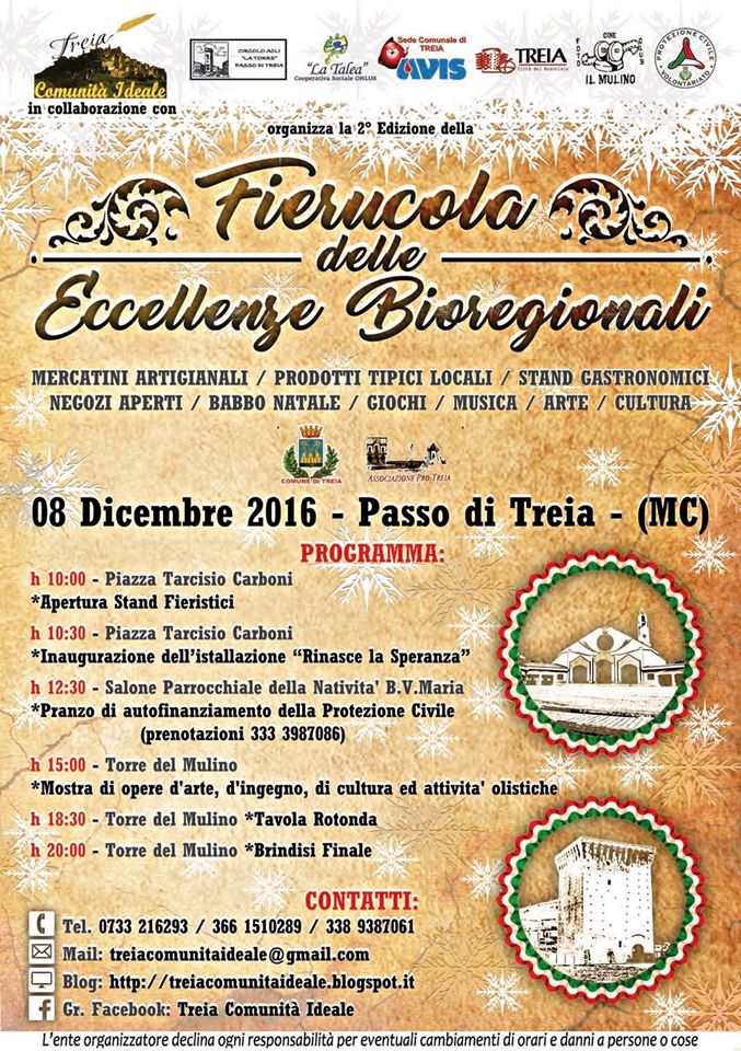 «A questo proposito ringraziamo la parrocchia di Treia, nella persona di don Gabriele Crucianelli, che ha subito acconsentito all’uso del portico della chiesa della Natività, ad alcuni membri della Protezione civile, che si sono offerti di preparare un pranzo sociale (il cui ricavato va a favore della Protezione Civile stessa) e a tutti gli espositori ed i privati che si sono messi in gioco per la riuscita della manifestazione».