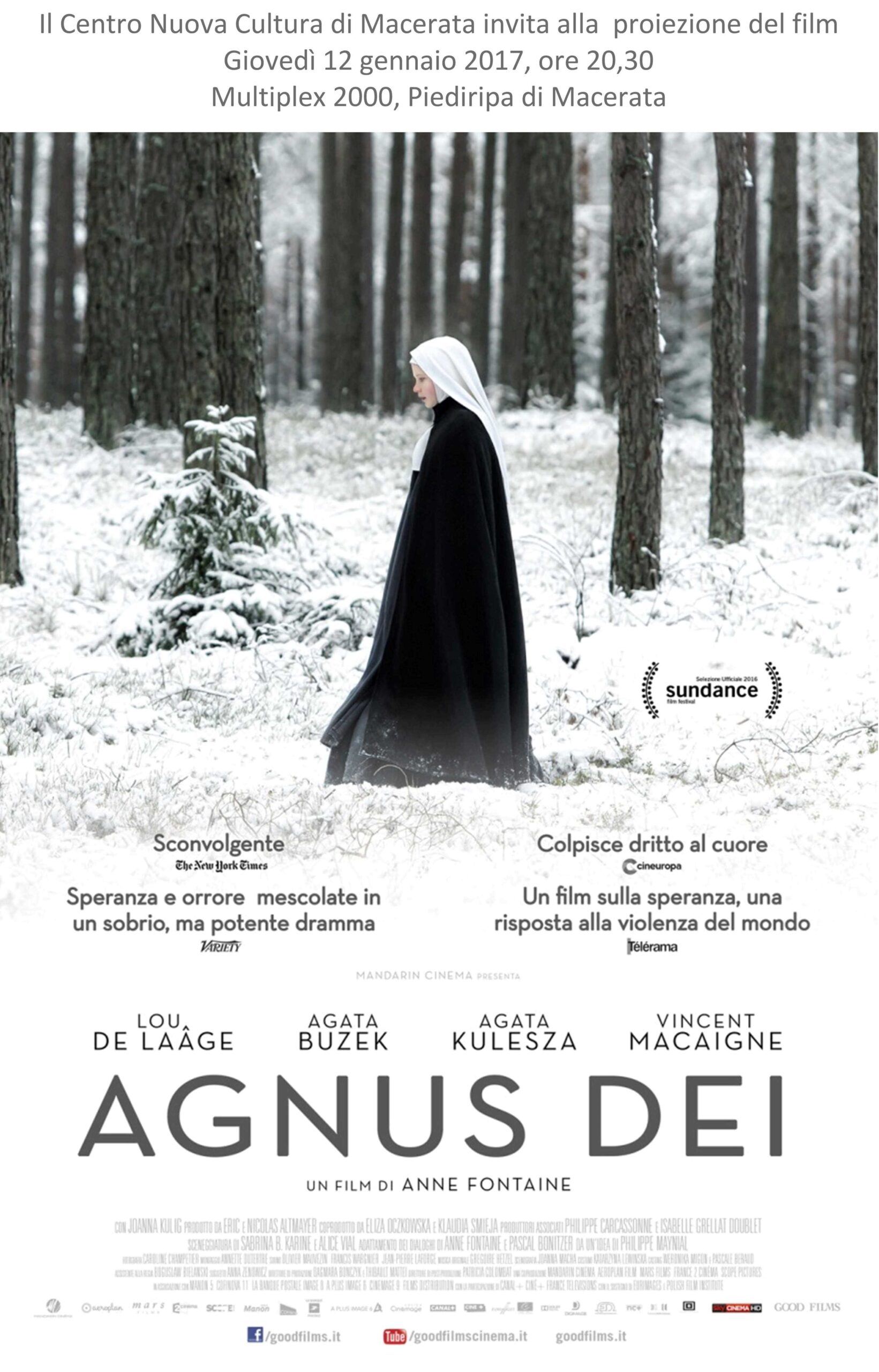 L‘associazione culturale «Centro Nuova Cultura» invita giovedì 12 gennaio, alle ore 20.30 presso il cinema Multiplex2000 a Piediripa di Macerata alla proiezione eccezionale del film diretto da Anne Fontaine e ambientato nella Polonia del 1945: «Agnus Dei». La trama racconta la delicata storia di Mathilde, giovane medico che entra in contatto con alcune suore che, oggetto di violenza da parte dei soldati sovietici, si ritrovano in stato di gravidanza.