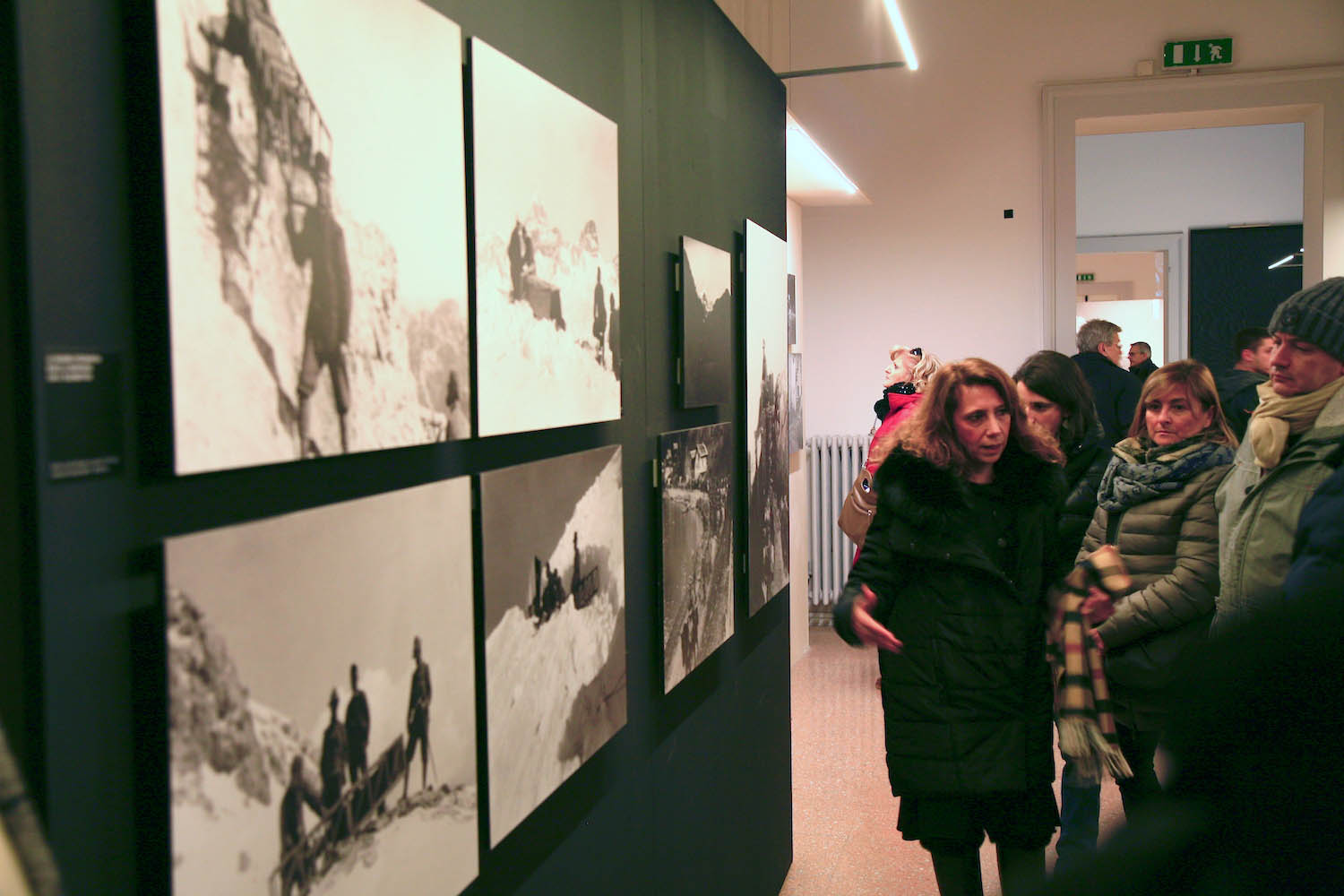 In questa straordinaria cornice si visita la mostra, già esposta nei locali dell’ex Upim Macerata, e che Emanuela Balelli, figlia del fotografo morto nel 1981, la illustra creando una forte partecipazione emotiva ricordando la generazione di fotografi della sua famiglia e dei ricordi dei racconti del padre sull’arte della fotografia. In quelle immagini si trova la fatica di scalare le montagne innevate, le trincee, il sacerdote che benedice prima della battaglia, donne e bambini nelle retrovie, i tanti paesaggi alpini delle valli del Piave e l’Isonzo e “i brandelli di muro”. Sono questi, e molti altri, i soggetti delle 240 immagini scattate durante gli anni della Prima Guerra mondiale dal fotografo e militare maceratese Carlo Balelli che all’epoca, ventenne, realizzò partecipando al conflitto. Le immagini sono di alta qualità, grazie alla maestria di Balelli nel fare risaltare nelle forme un bianco e nero bellissimo e molto innovativo per l’epoca. La prima guerra mondiale è, dal punto di vista mediatico, il primo conflitto che potremmo dire seguito con i “moderni” mezzi del giornalismo.