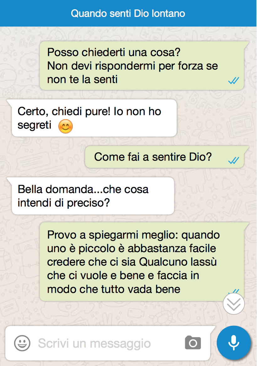 L’ebook contiene trenta situazioni in cui ciascuno può trovarsi, in qualunque età della vita. «Abbiamo immaginato – prosegue il comunicato – che il protagonista della situazione potesse contattare o essere contattato su WhatsApp da Don Bosco, proprio come i suoi ragazzi a Valdocco, per instaurare un dialogo con quel padre, maestro ed amico che tiene davvero alla loro felicità».
