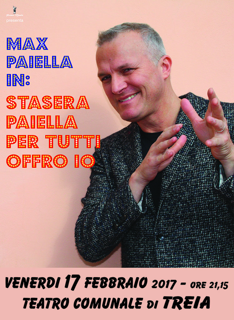 Dalla storica trasmissione “Il Ruggito del Coniglio” di Radio Due al palcoscenico del Teatro comunale di Treia, Max Paiella. Showman incredibile e affascinante, in tv come in radio; strepitoso nella versione “live” dei teatri. Venerdì 17 febbraio Paiella sarà in scena a Treia con il suo “Stasera Paiella per tutti … offro io”, uno show esilarante e imperdibile, uno spettacolo che racchiude un concentrato di pezzi comici, canzoni e protagonisti freschi di “… giornale”, creati (davvero quotidianamente) assieme ad Antonello Dose e Marco Presta nella trasmissione radiofonica “Il Ruggito del Coniglio”.