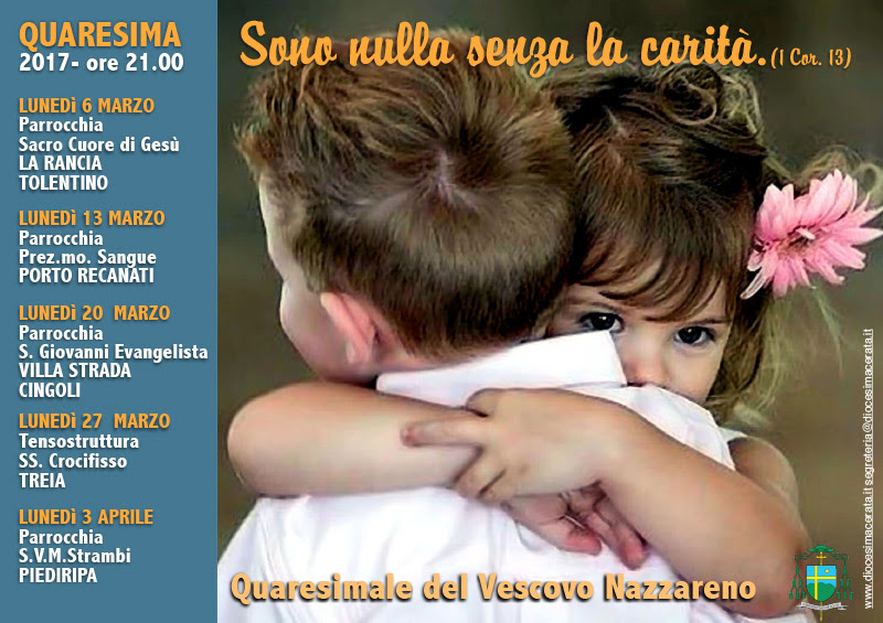 Sul versetto di San Paolo «Sono nulla senza la carità», gli appuntamenti – tutti con inizio alle ore 21 e trasmessi dai media diocesani – inizieranno lunedì 6 marzo, nella zona più colpita della Diocesi, Tolentino: il primo Quaresimale, infatti, si svolgerà presso la parrocchia Sacro Cuore di Gesù in località La Rancia. Lunedì 13 marzo monsignor Marconi terrà invece la sua riflessione nella parrocchia del Preziosissimo Sangue, a Porto Recanati, che in questi mesi ha accolto sulla costa diverse centinaia di terremotati sfollati.
