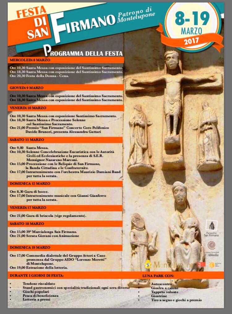 L’edizione 2017 della tradizionale e antica Festa di San Firmano, patrono di Montelupone, offre dall’8 al 19 marzo un programma ricco e variegato, sia sul versante religioso che su quello civile. A San Firmano ci sono le origini ultramillenarie del borgo: la popolazione tutta sente quel luogo, sede dell’Abbazia che ha il sapore e il fascino inconfondibili della Storia e dell’antica religiosità che trasudano dal manufatto, come propria radice.