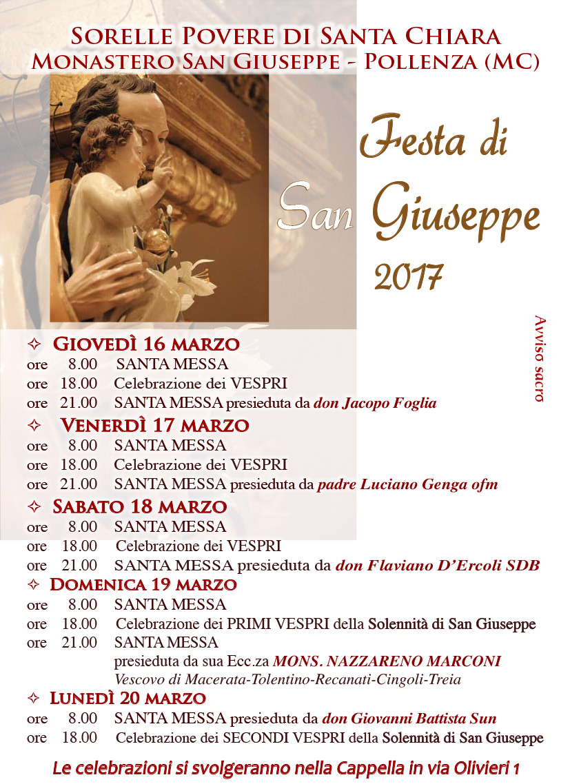 Si rinnova anche quest’anno, a Pollenza, l’appuntamento per la festa di San Giuseppe. Presso il monastero delle Sorelle Povere di Santa Chiara, a partire da domani, giovedì 16 marzo, con i Vespri e le Sante Messe – celebrate dai sacerdoti don Jacopo Foglia, padre Luciano Genga e don Flaviano D’Ercoli – inizierà il triduo che culminerà domenica 19 marzo con l’Eucaristia presieduta dal vescovo Nazzareno Marconi. Le funzioni si svolgeranno nella Cappella di via Olivieri.