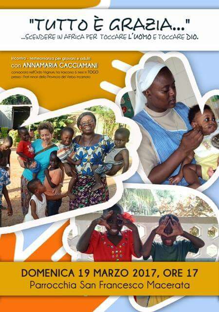 Questo sarà l’appuntamento in programma domenica 19 marzo, nella parrocchia San Francesco di Macerata, dove la consacrata nell’Ordo virginum Annamaria Cacciamani sul tema «Tutto è grazia: scendere in Africa per toccare l’uomo e toccare Dio» offrirà la propria testimonianza sui sei mesi trascorsi in Togo presso i Frati minori della Provincia del Verbo Incarnato.