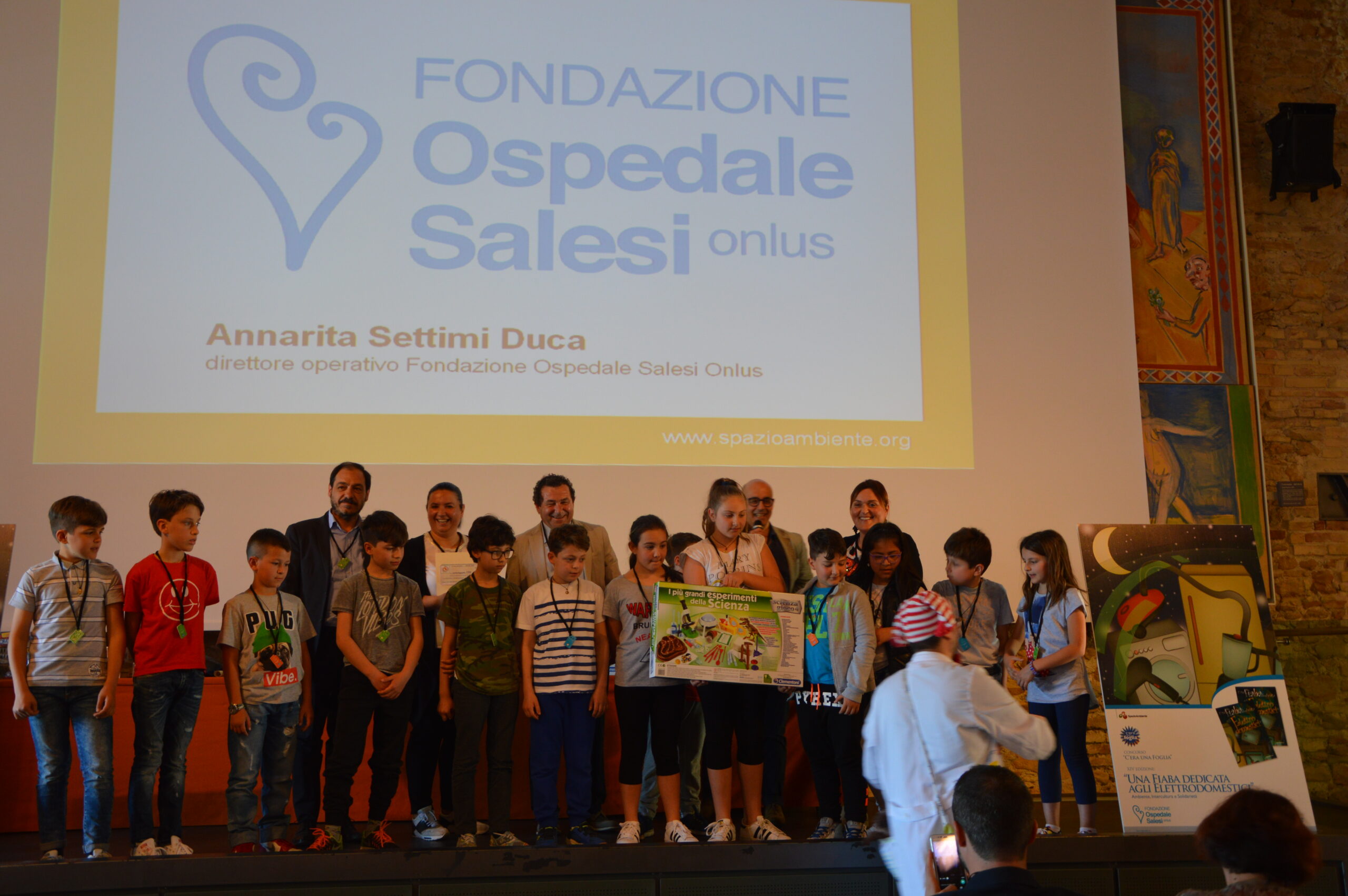 Alla manifestazione finale sono intervenuti Annarita Settimi Duca, direttore operativo Fondazione Ospedale Salesi Onlus, Duilio Compagnucci della Puli Ecol Recuperi Srl di San Severino Marche, i rappresentanti del Consorzio Nazionale Esa gestione e Raee ed una referente della Ely – La Spiga Edizione di Recanati. I proventi derivanti dalla vendita ad offerta del libro, che raccoglie tutti i lavori in concorso, come nelle precedenti edizioni, saranno destinati ad un progetto “Le favole della buonanotte”. La Fondazione Salesi Onlus realizza nei reparti questo progetto per creare un momento di serenità e di pace nei bambini ricoverati prima della buonanotte con la lettura di fiabe, il racconto di favole e filastrocche, il disegno e il gioco.