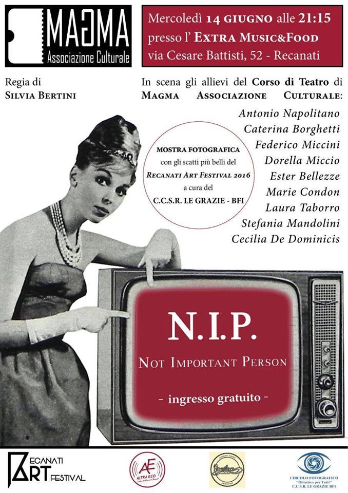 Mercoledì 14 giugno, alle ore 21.15, all’Extra di Recanati, in Via Cesare Battisti una nuova serata di spettacolo in cui Magma riproporrà la rappresentazione finale del corso realizzato presso la sede dell’Associazione Altra Eco in via Campo dei Fiori a Recanati. “NIP – Not Important Person”, narra di «quei 50 milioni di italiani, carne da auditel e da sondaggio, che non vivono nel paradiso dei VIP, pur adorandoli. I NIP protagonisti, bizzarri e irriverenti, si alterneranno per raccontarci le loro storie tra situazioni surreali (a volte paradossali) e tragicomiche: signori che divagano, bancomat parlanti, barman detective e attrici disoccupate».