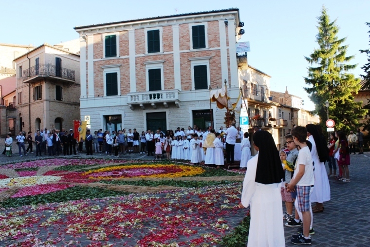 Poi il momento devozionale; centro storico chiuso al traffico e tanta affluenza popolare per la processione del SS. Sacramento portato da don Gianfranco, contornato dai bambini della prima Comunione e seguito da una gran folla, con autorità, gonfalone e tanto di banda cittadina e, anche, di turisti arrivati in paese per vivere in diretta l’ormai classica infiorata artistica di Montelupone.