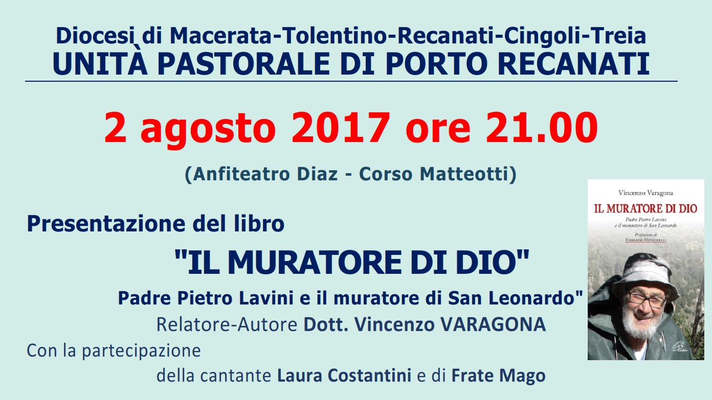 Proseguono gli incontri culturali a Porto Recanati (leggi qui l’articolo). Stasera, alle ore 21, presso l’Anfiteatro Diaz di Porto Recanati, avrà luogo la presentazione del libro “Il Muratore di Dio” del giornalista Rai Vincenzo Varagona. Il volume è dedicato alla vita di padre Pietro Lavini (leggi qui).