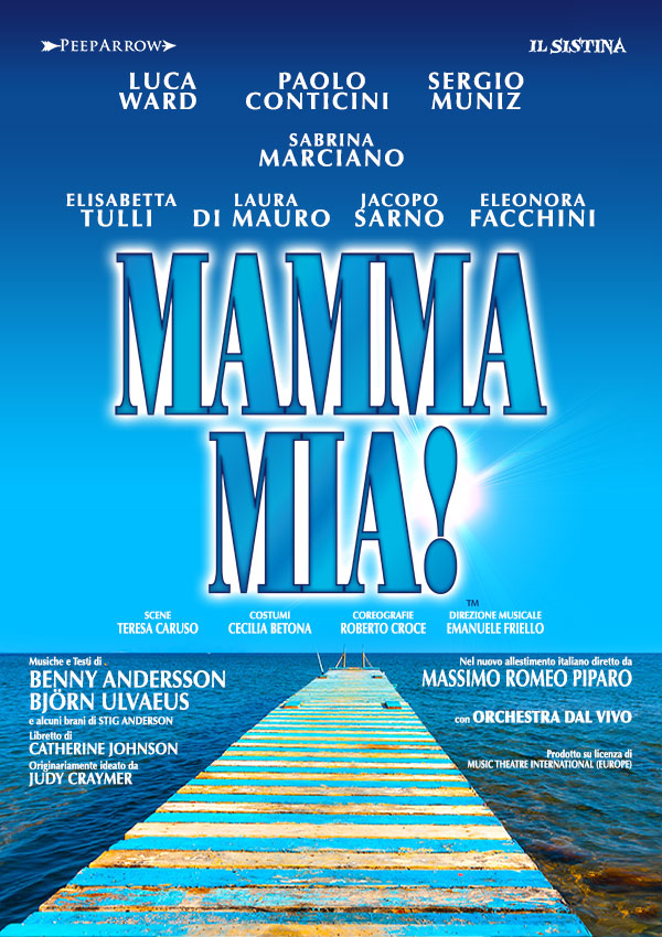 L’attesissimo musical è firmato da Massimo Romeo Piparo: nel ruolo dei protagonisti tre attori amatissimi dal grande pubblico e già affermati anche nel Musical, Luca Ward, Paolo Conticini e Sergio Muniz, nei personaggi che nel film vennero interpretati da Stellan Skarsgard, Pierce Brosnan e Colin Firth. Nel ruolo di Donna la bravissima Sabrina Marciano, punta di diamante del musical italiano, reduce da una clamorosa affermazione nei panni della maestra di danza nell’acclamato Billy Elliot, mentre la giovane Sofia (Sophie) sarà interpretata da Eleonora Facchini, classe 1992, che con il suo talento ha superato brillantemente le affollatissime audizioni sul palco del Sistina. Accanto a loro anche Elisabetta Tulli e Laura di Mauro nei ruoli delle scatenate amiche del cuore di Donna, rispettivamente Rosie e Tanya, Jacopo Sarno alias Sky, un cast di oltre 30 artisti e l’Orchestra diretta dal Maestro Emanuele Friello, posizionata all’interno della scena.