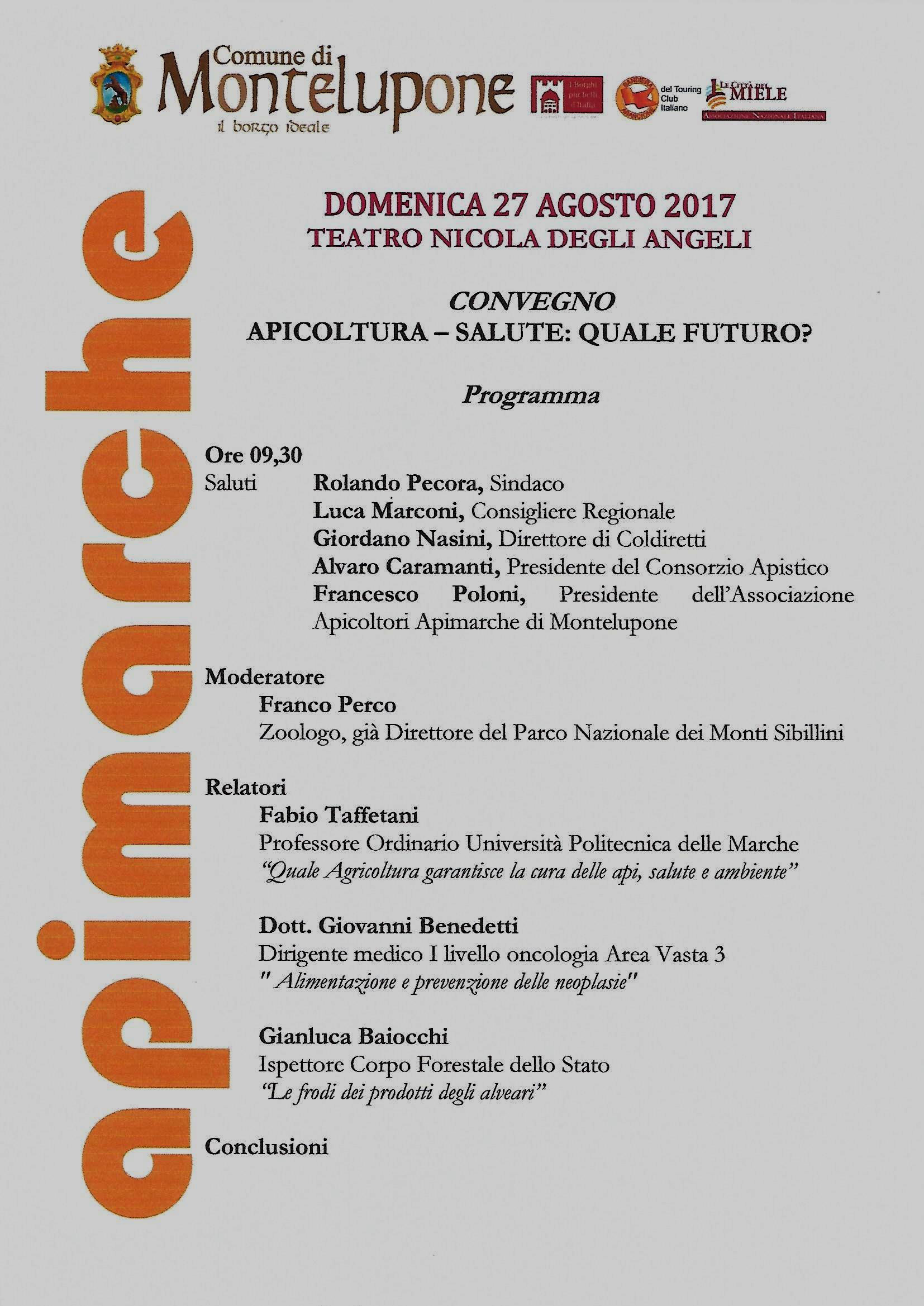 L’aspetto scientifico di ApiMarche 2017 sarà approfondito attraverso il Convegno “Apicoltura-Salute: Quale Futuro?” che si terrà nella mattinata di domenica 27 agosto, dalle ore 9.30, al teatro “Nicola Degli Angeli” di Montelupone. Si tratta dunque di un tema sempre più importante, dibattuto e di grande attualità, che merita di essere divulgato tra i consumatori. Il convegno inizierà con i saluti portati dal sindaco Rolando Pecora; dal consigliere regionale Luca Marconi; dal direttore Coldiretti Giordano Nasini; presidente Consorzio apistico Alvaro Caramanti; e dal presidente Associazione apicoltori Apimarche di Montelupone Francesco Poloni. Si entrerà poi nel vivo delle argomentazione, avvalendosi quale moderatore di Franco Perco, già direttore del Parco nazionale dei Monti Sibillini.