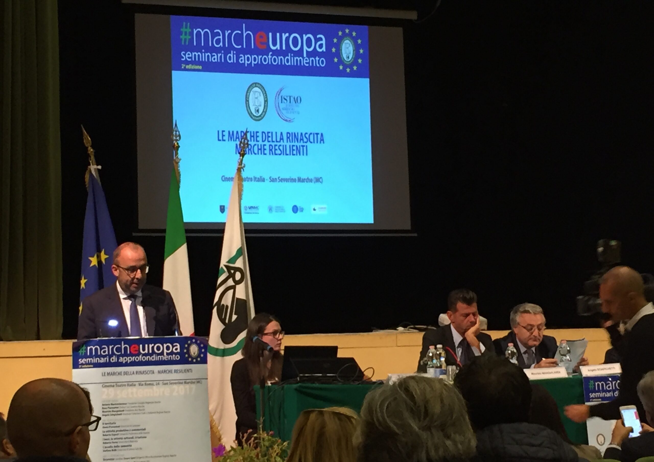 Trovare insieme nuove strade per l’Appennino ferito e per le Marche, ragionando su come legare la ricostruzione allo sviluppo, la messa in sicurezza del territorio al lavoro, il turismo ai servizi per le comunità, il paesaggio alla cultura. Questi i temi centrali della prima delle cinque tappe di #marcheuropa, il programma di seminari formativi per gli amministratori locali, organizzato dal Consiglio regionale, in collaborazione con l’Istao. Al cinema teatro Italia di San Severino Marche oltre cento persone, tra sindaci, assessori, consiglieri comunali, cittadini, studenti, imprenditori, si sono confrontate su “Le Marche della Rinascita, Marche Resilienti” con studiosi, accademici, rappresentanti delle forze sociali ed economiche. Una lunga giornata di dibattiti e approfondimenti, al termine della quale è intervenuto il Ministro della coesione territoriale Claudio De Vincenti che dopo aver elogiato il progetto formativo organizzato dal Consiglio regionale, ha ricordato i provvedimenti fatti dal Governo, anche in un’ottica di sviluppo futuro.
