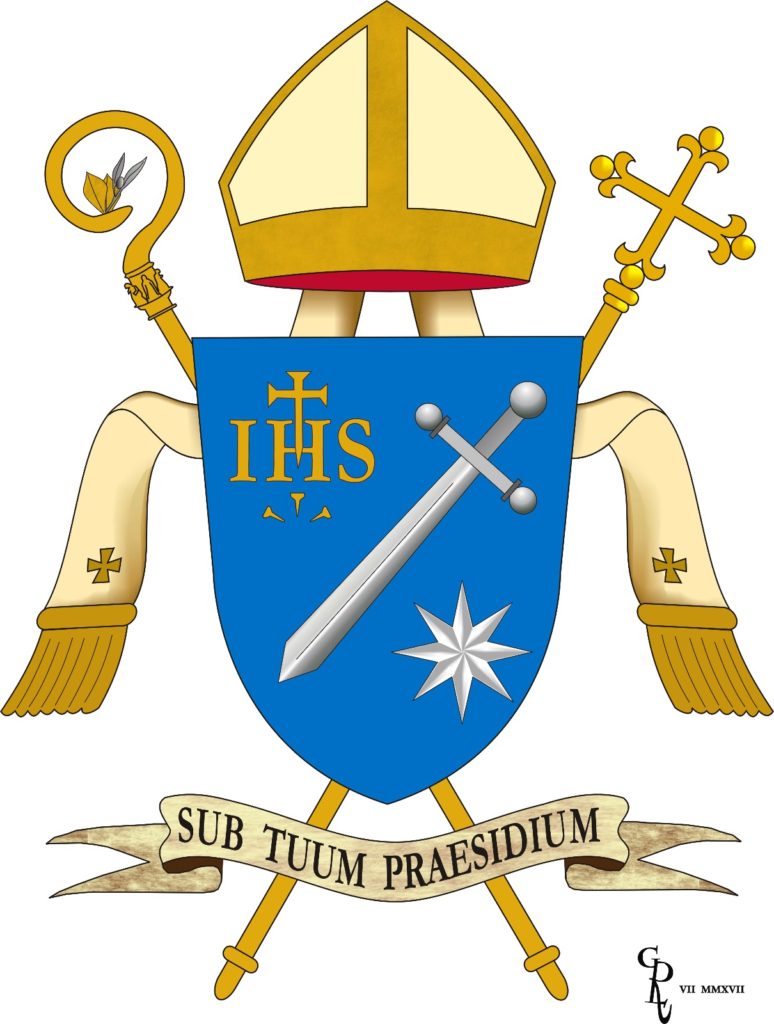 È su campo azzurro perché il motto è Sub tuum praesidium (Sotto la tua protezione, ndr) perché la Mater Misericordiae è la patrona della diocesi, e di conseguenza il colore della nostra diocesi è l’azzurro.