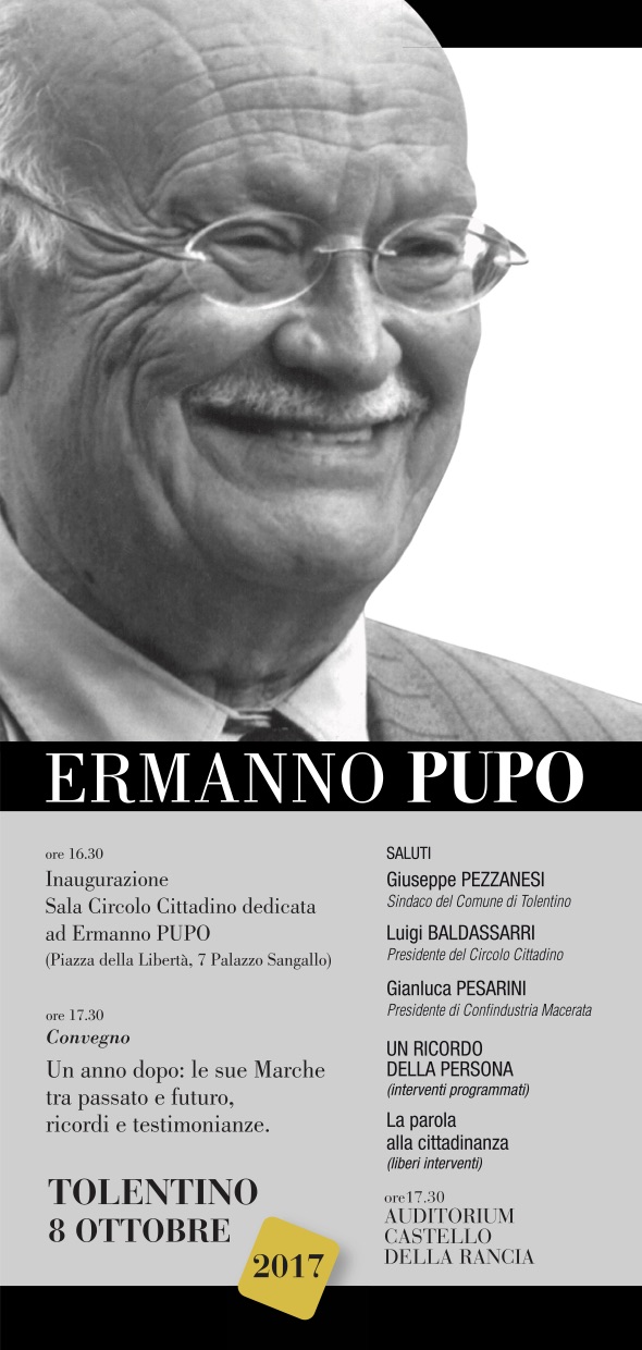 Ad un anno dalla scomparsa del dott. Ermanno Pupo, figura di riferimento per la storia recente del territorio e delle imprese. Domenica 8 ottobre a Tolentino verrà inaugurata la Sala Circolo cittadina a lui dedicata a Palazzo Sangallo in Piazza della Libertà.