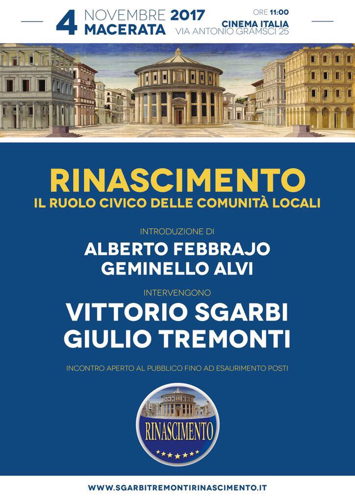 E’ in questa logica che tanto a fronte della crisi generale dell’Europa di Bruxelles (si veda, comunque inquietante, il caso della Catalogna), quanto a fronte della crisi degli Stati-nazione centralizzati e gerarchizzati, liberamente ne discuteranno Alberto Febbrajo e Geminello Alvi e poi Vittorio Sgarbi e Giulio Tremonti, sabato 4 novembre, dalle ore 11 alle 15, al Cinema Italia di Macerata. Ingresso libero fino a esaurimento posti.