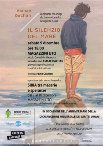 In occasione della giornata dei Diritti umani e nell’ambito della Rassegna “Tutto un altro Natale” organizzata dalla Bottega del commercio equo e solidale dal 7 al 10 dicembre, in collaborazione con l’Associazione Refugees Welcome Italia – Sezione di Macerata e con la festa del libro Macerata Racconta, sabato 9 dicembre 2017, alle ore 18.00 presso i Magazzini UTO – Vicolo Consalvi a Macerata Presentazione del libro “Il silenzio del mare” di Asmae Dachan.
