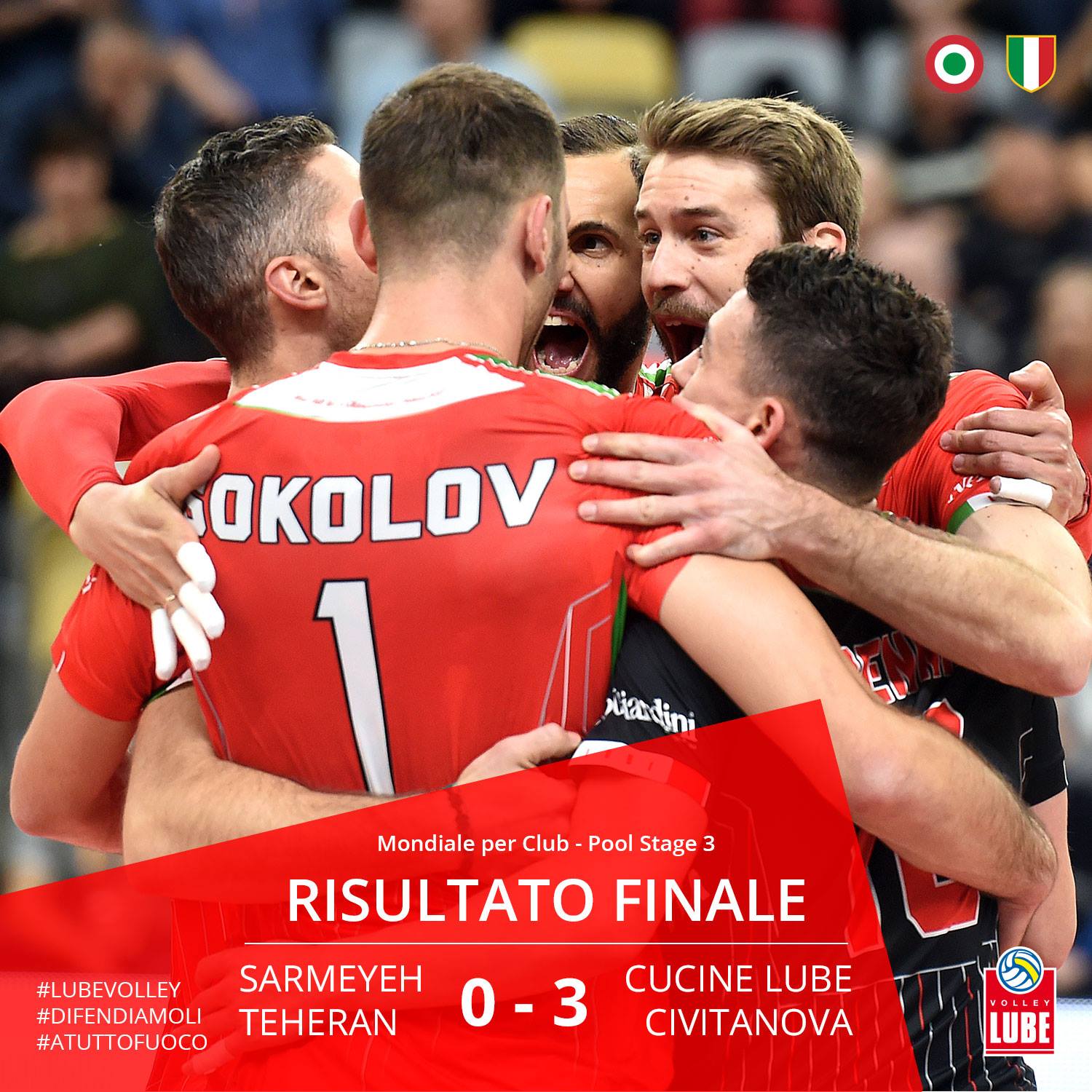 Terza vittoria su tre gare e primo posto assicurato nel Pool A del Mondiale per Club per la Cucine Lube Civitanova. Nella gara di giovedì 14 dicembre ad Opole, i cucinieri si impongono in tre set anche sugli iraniani del Sarmayeh Bank Teheran e conquistano definitivamente la vetta del girone più difficile ed equilibrato del torneo. Una prestazione concreta firmata specialmente nei finali dei tre parziali, dove i cucinieri hanno sempre piazzato il break decisivo contro una formazione iraniano tutt’altro che demotivata nonostante la certezza di essere già eliminata.