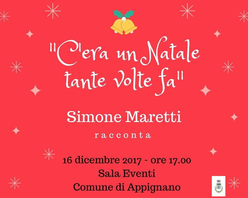 Un fine settimana dedicato ai racconti di Natale con Simone Maretti. Si inizia sabato 16 dicembre alle ore 17; il primo pomeriggio è intitolato «C’era un Natale tante volte fa», ad Appignano, a cura del Comune e dell’Associazione Prometeo e si svolgerà presso la Sala Eventi del Comune.