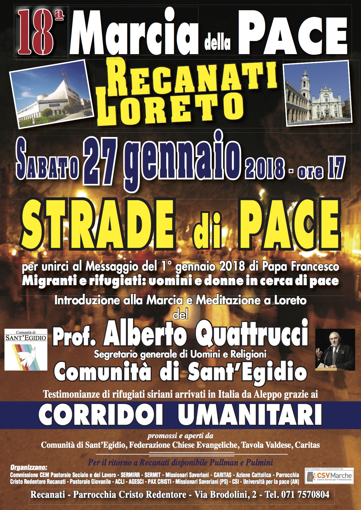 Il monito contenuto nel Messaggio di papa Francesco per la 51ª giornata mondiale della Pace, celebrata il 1 gennaio 2018, è anche la «A speranza che accompagnerà quanti prenderanno parte alla Marcia della Pace Recanati– Loreto il 27 gennaio 2018.
