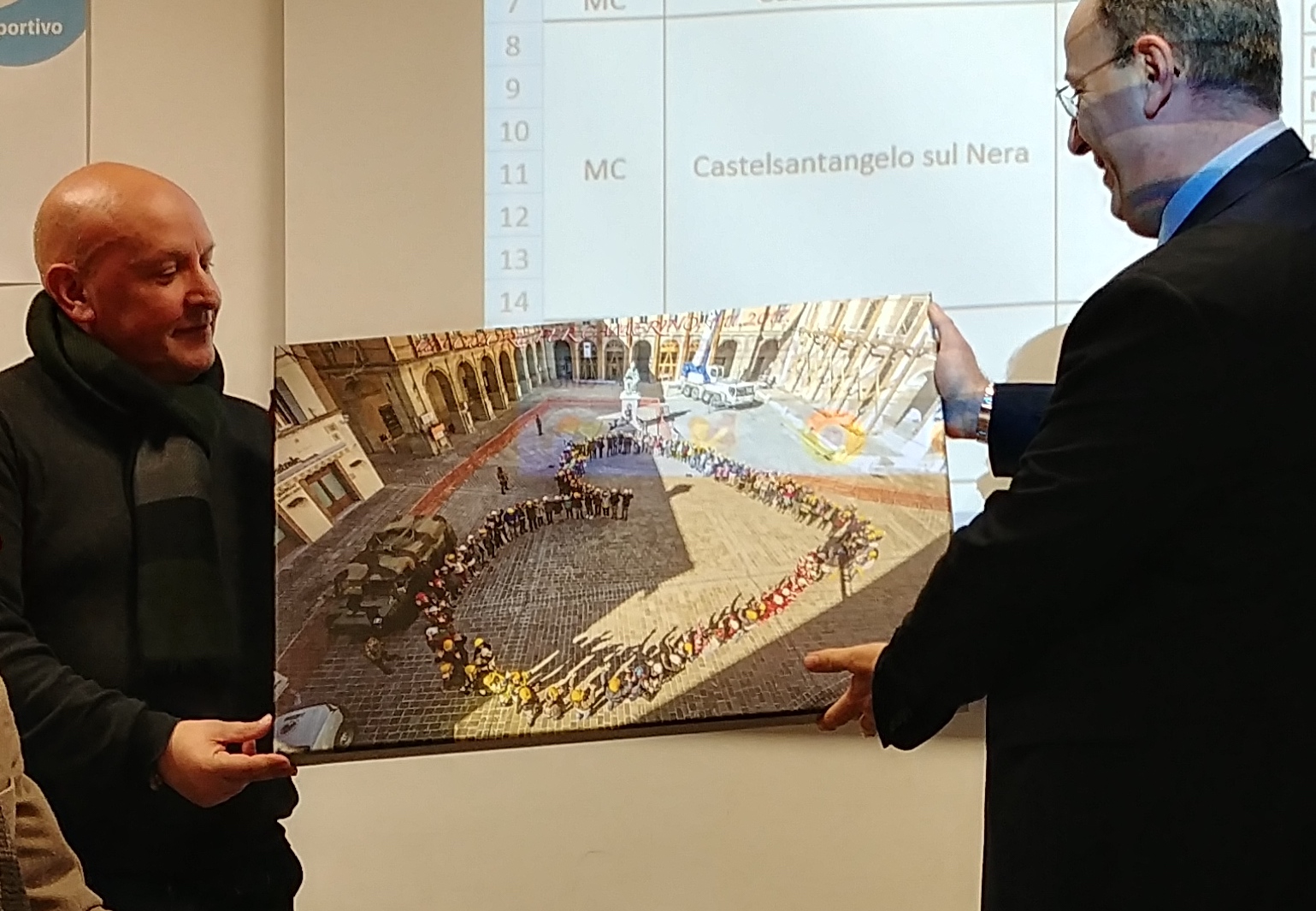 In occasione dell’incontro del sindaco con la città, ieri, giovedì 25 gennaio, il fotografo Roberto Conti ha donato al primo cittadino di Camerino, Gianluca Pasqui, una tela con la stampa di una immagine scattata durante il progetto “Un cuore per Camerino”, flash mob realizzato nei mesi scorsi in Piazza Cavour.