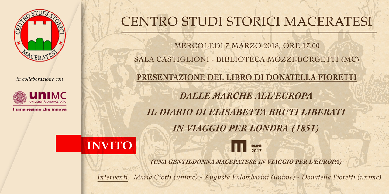 Mercoledì 7 marzo, alle ore 17, nella Sala Castiglioni della Biblioteca Mozzi-Borgetti di Macerata, il Centro Studi Storici Maceratesi presenterà il libro della prof.ssa Donatella Fioretti, dal titolo: Dalle Marche all’Europa. il Diario di Elisabetta Bruti Liberati, in viaggio per Londra (1851)