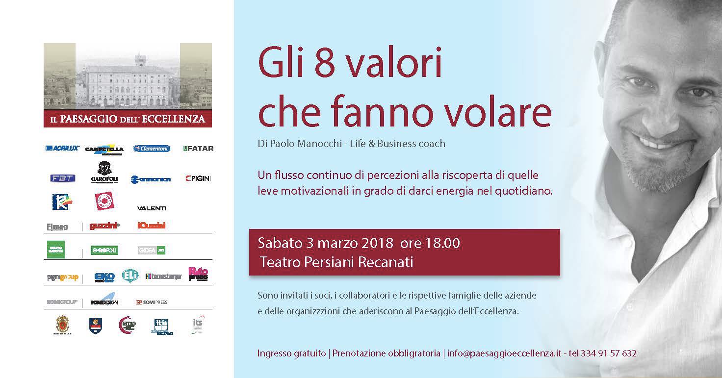 Sabato 3 marzo, alle ore 18, al Teatro Persiani di Recanati, Paesaggio dell’Eccellenza porta sul palco “Gli 8 valori che fanno volare”, un format coinvolgente e stimolante di e con Paolo Manocchi. Gli 8 valori che fanno volare non sono un incontro di formazione ma contengono principi formativi. Il format non è uno spettacolo ma all’interno ci sono momenti spettacolari. Gli 8 valori che fanno volare educano, coinvolgono, motivano, fanno ridere e commuovere. In definitiva sono un bel momento da vivere con serenità per riscoprire alcuni valori che ogni giorno possono darci la motivazione giusta per affrontare la vita.