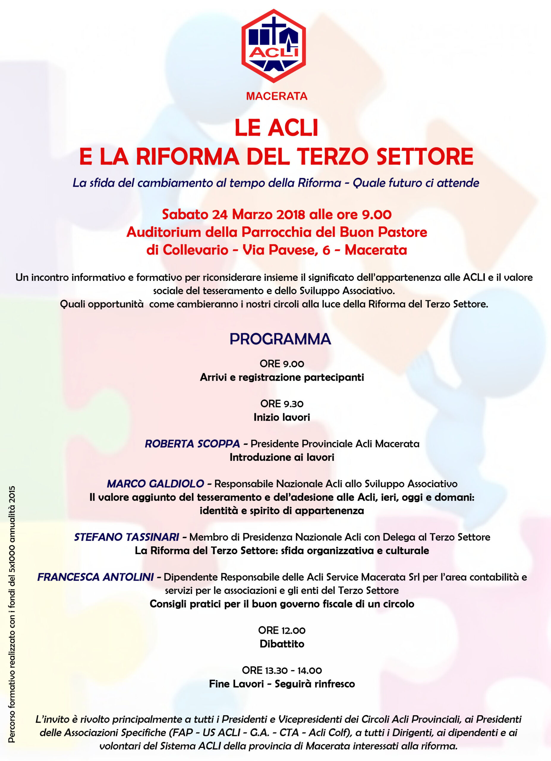 Per non lasciarsi cogliere impreparate ai cambiamenti appena introdotti e a quelli che arriveranno nei prossimi mesi, le Acli di Macerata organizzano per sabato 24 marzo alle ore 9 a Macerata, presso l’Auditorium della Parrocchia del Buon Pastore di Collevario, un incontro rivolto a tutti i dirigenti dei Circoli Acli, ai Presidenti delle Associazioni Specifiche ed ai i Dirigenti, dipendenti ed volontari del Sistema Acli Provinciale.