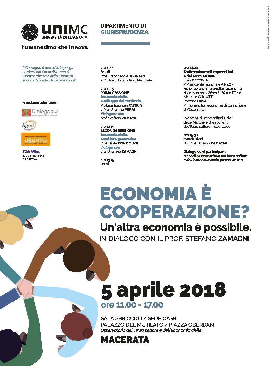 L’economista Stefano Zamagni, ex presidente dell’Agenzia per il terzo settore, sarà tra i protagonisti del convegno «Economia è cooperazione? Un’altra economia è possibile» organizzato dall’Università di Macerata, Dipartimento di Giurisprudenza, in collaborazione con le associazioni “Dialogo più”, Agorà – Scuola di partecipazione, CSV Marche, Übüntü e Giò Vita con il patrocinio del Comune di Macerata, organizza per giovedì 5 aprile dalle ore 11 alle 17 nella Biblioteca di Ateneo Casb in piazza Oberdan.