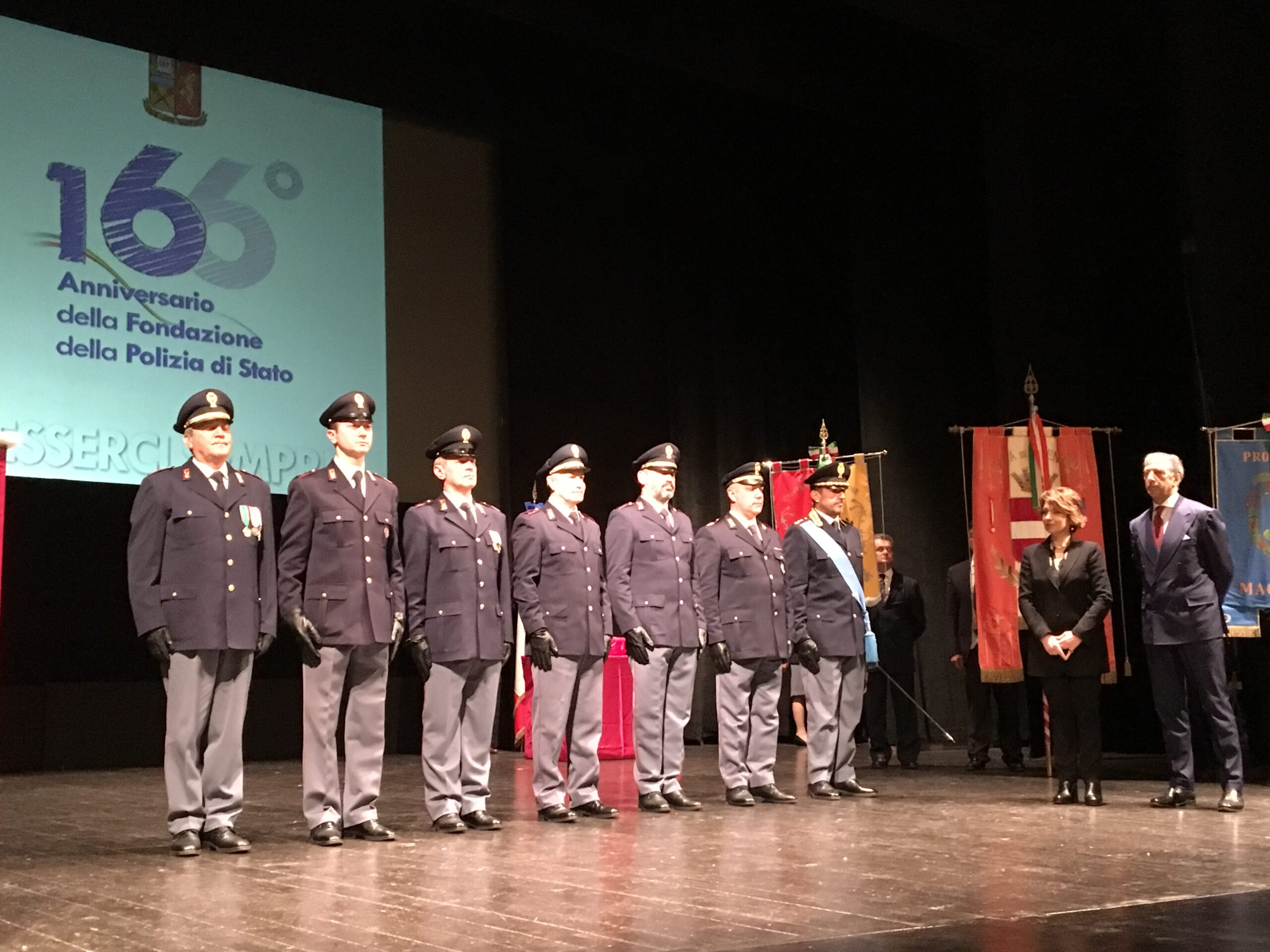 Cerimonia al teatro Lauro Rossi di Macerata per il 166° anniversario della Fondazione della Polizia di Stato. Dopo la lettura dei messaggi pervenuti per l’occasione da parte del Presidente della Repubblica, dal Ministro dell’Interno e dal Capo della Polizia, il Questore di Macerata, Antonio Pignataro ha salutato e ringraziato tutti gli appartenenti della Polizia di Stato della provincia di Macerata per i lavoro svolto e per i risultati conseguiti.