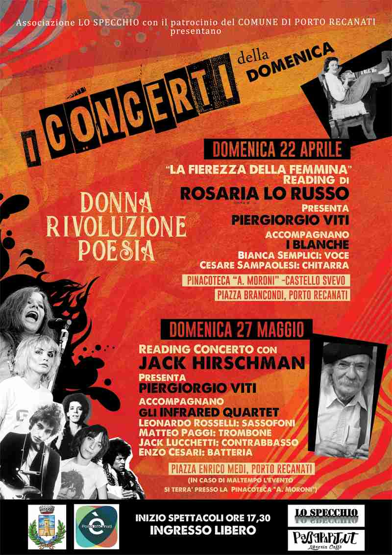 Appuntamento addirittura di livello nazionale è invece quello del 27 maggio, ore 17.30 presso la Piazza E.Medi, quando Porto Recanati ospiterà un mito della poesia americana e mondiale: Jack Hirschman accompagnato dal quartetto Infrared quartet con i musicisti: Leonardo Rosselli:sassofoni, Matteo Paggi:trombone, Jack Lucchetti:contrabbasso, Enzo Cesari:batteria. Poeta proveniente dalla cultura beat (è stato amico di Ferlinghetti e Corso), geniale, è uno dei pochi poeti capaci di fondere diversi elementi, spesso distantissimi tra loro: l’amore, la ribellione, l’impegno sociale, il “mood” beat, il surrealismo, la cultura yiddish, plasmando una lingua nuova, ricca di invenzioni. Jack Hirschman, classe 1933, è tutto questo e molto altro ancora, perché oltre ad essere poeta di fama mondiale, è anche traduttore, scrittore, pittore e attivista politico in favore dei “deboli”. Con oltre 100 libri all’attivo, è stato, alla UCLA, professore, tra gli altri, di Jim Morrison, prima di essere licenziato a causa della sua propaganda contro la guerra in Vietnam. E’ considerato il fondatore del World Poetry Movement e della Revolutionary Poets Brigade e attualmente vive a San Francisco, in California. Tutti gli eventi sono a ingresso libero.