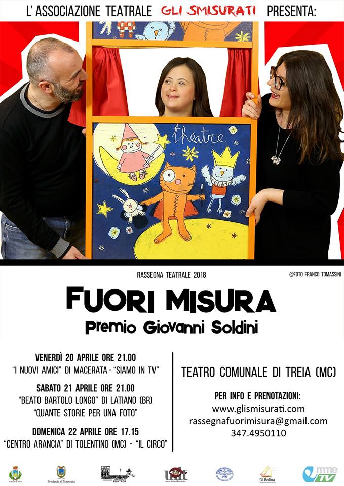 L’associazione culturale teatrale Gli Smisurati rende noti i nomi delle Associazioni teatrali selezionate per la partecipazione alla rassegna “Fuori Misura”, in programma, presso il Teatro comunale di Treia, il 20, 21 e 22 aprile 2018. Nell’ordine: Il 20 aprile ore 21.15, aprirà la rassegna l’associazione ” I nuovi amici” di Macerata, con lo spettacolo dal titolo “Siamo in TV”. Il 21 aprile ore 21.15, la compagnia “Beato Bartolo Longo” di Latiano (BR), porterà in scena “Quante storie per una foto”. Il 22 aprile ore 17.00, il Centro Arancia di Tolentino si esibirà con “Il Circo”. La serata del 21 aprile vedrà anche la partecipazione, fuori concorso, dell’associazione “Di Bolina”; mentre domenica 22 saranno gli ospiti dell’Associazione i “Millecolori” di Camerino si esibiranno in uno spettacolo musicale.