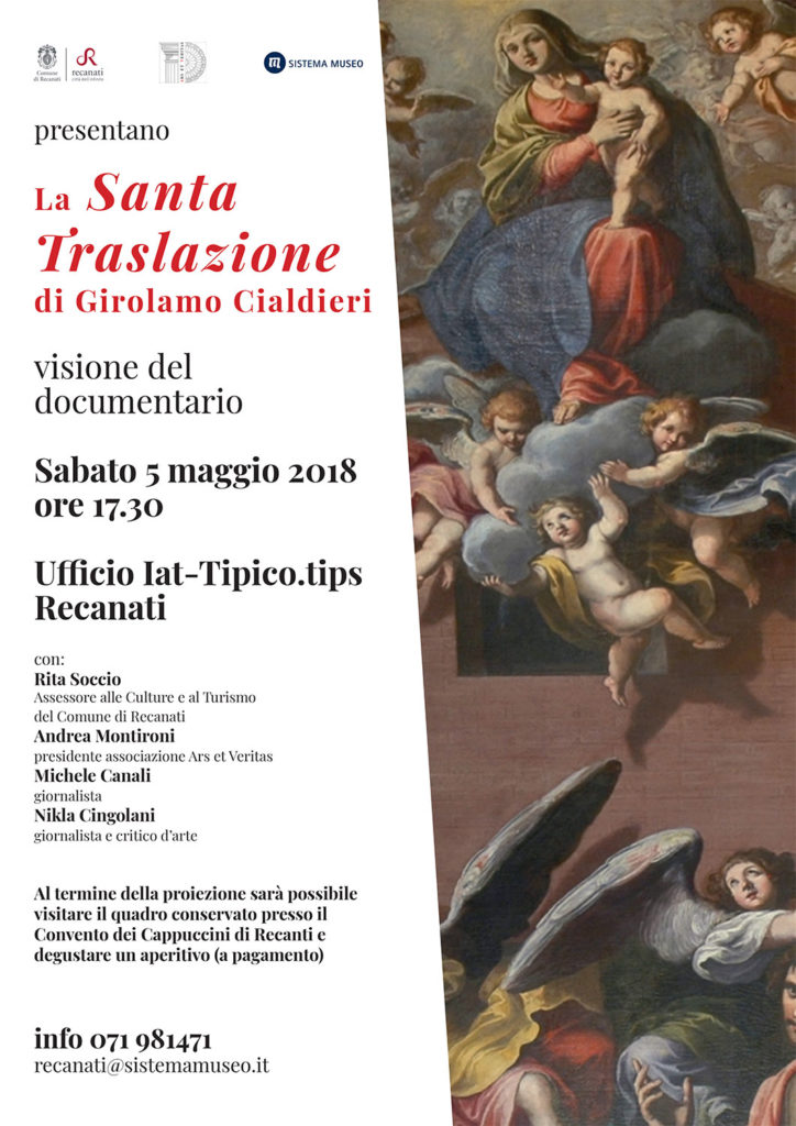 Il documentario “La Santa Traslazione delle Santa Casa di Loreto. Opera di G. Cialdieri” verrà proiettato nella suggestiva sala video dello IAT di Recanati sabato 5 maggio alle 17.45. Interverranno all’incontro: l’assessore alle culture e P.I. Rita Soccio il presidente di Ars et Veritas, Andrea Montironi, il giornalista Michele Canali e la giornalista e critico d’arte Nikla Cingolani.